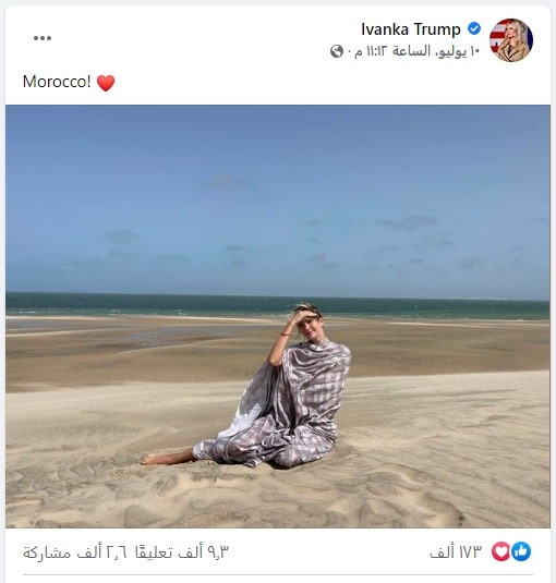 وطن- نشرت إيفانكا ترامب، ابنة الرئيس الأمريكي السابق، صورا جديدة عبر حسابها الرسمي بفيسبوك، كشفت عن تواجدها بالمغرب.