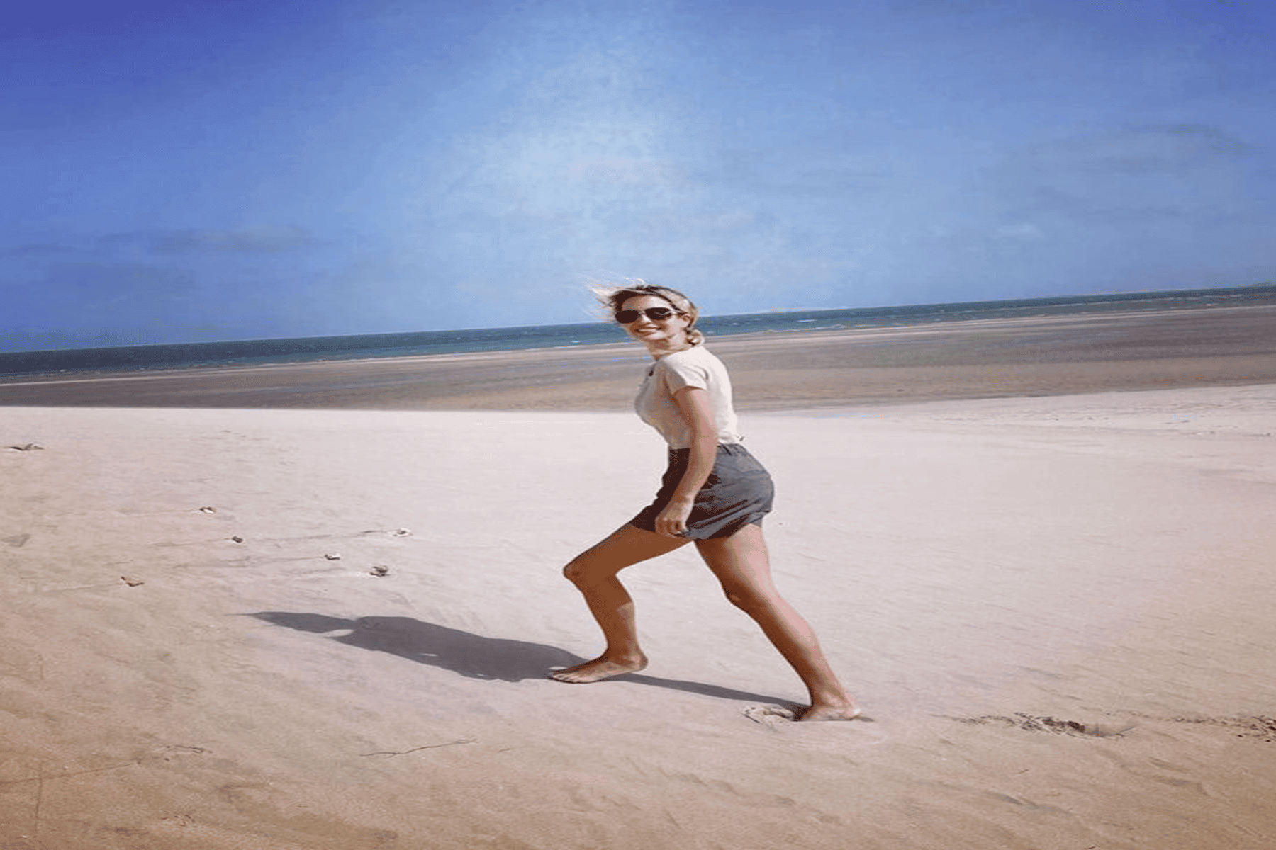 وكانت تجلس على الرمال في وضعية التصوير على الشاطئ الساحلي وورائها البحر.