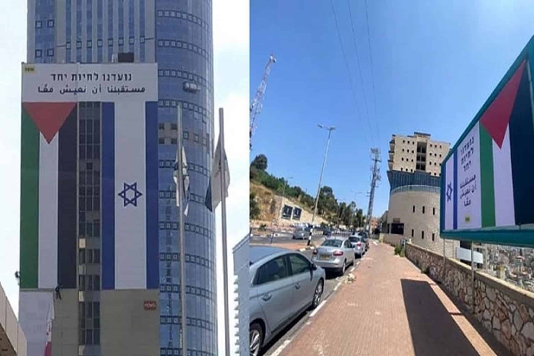 ومؤخرا أيضا، اندلعت عاصفة بعد لافتة ضخمة علقتها إحدى الحركات في مجمع أبراج بورصة في مدينة “رمات غان” الإسرائيلية، ووضع عليها العلم الإسرائيلي والفلسطيني.