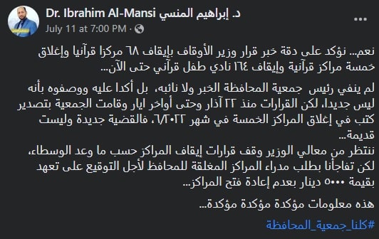 وكان مؤسس حملة “كلنا جمعية المحافظة” إبراهيم المنسي، قد أعلن عبر حسابه الرسمي على موقع “فيسبوك”، الاثنين، عن قرار لوزير الأوقاف الأردني محمد الخلايلة، بـ”إيقاف 68 مركزا قرآنيا، وإغلاق خمسة مراكز، وإيقاف 164 نادي طفل قرآني حتى الآن”.