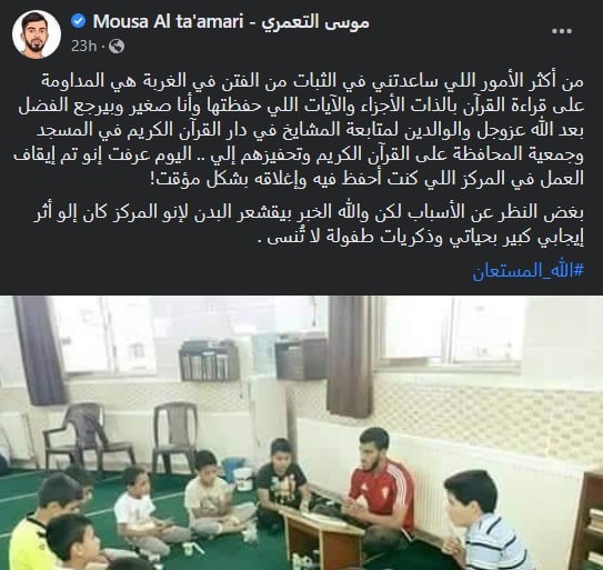 وقال “التعمري” في تدوينة له عبر حسابه بموقع التواصل الاجتماعي “فيسبوك” رصدتها “وطن“: “من أكثر الأمور اللي ساعدتني في الثبات من الفتن في الغربة هي المداومة على قراءة القرآن بالذات الأجزاء والآيات اللي حفظتها وأنا صغير وبيرجع الفضل بعد الله عزوجل والوالدين لمتابعة المشايخ في دار القرآن الكريم في المسجد وجمعية المحافظة على القرآن الكريم وتحفيزهم إلي”.