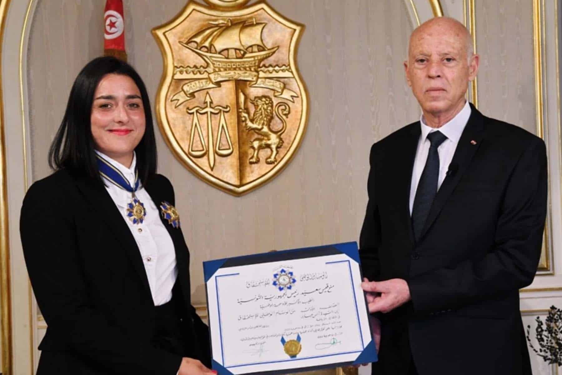 وكرم الرئيس التونسي قيس بن سعيد، اللاعبة جابر خلال استقباله لها، بحضور زوجها ومعدها البدني كريم كمون ومدربها عصام الجلالي وعائلتها داخل القصر الجمهور، بأعلى وسام رياضي في دولة تونس.