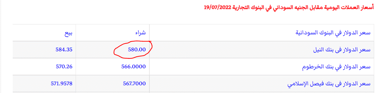 هذا وشهد سعر الدولار في السودان اليوم الثلاثاء 19 يوليو 2022 في البنوك ارتفاعا ملحوظا بالمقارنة مع أسعار أمس الإثنين، بحسب الموقع الرسمي لبنك الخرطوم.