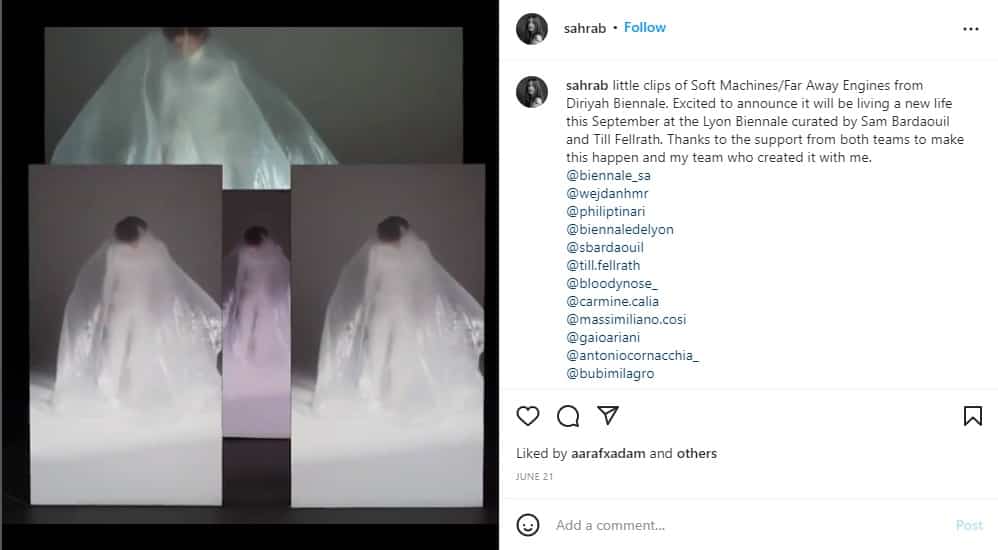 في أحدث أعمالها ، “الآلات الناعمة / محركات بعيدة” في عام 2021 ، والتي تم تكليفها به في أول فاعليات “بينالي الدرعية” المعاصر في الرياض، أظهرت الشاشات أفرادًا يتفاعلون مع بعضهم البعض، ويتحركون ويتشابكون ويتعانقون.