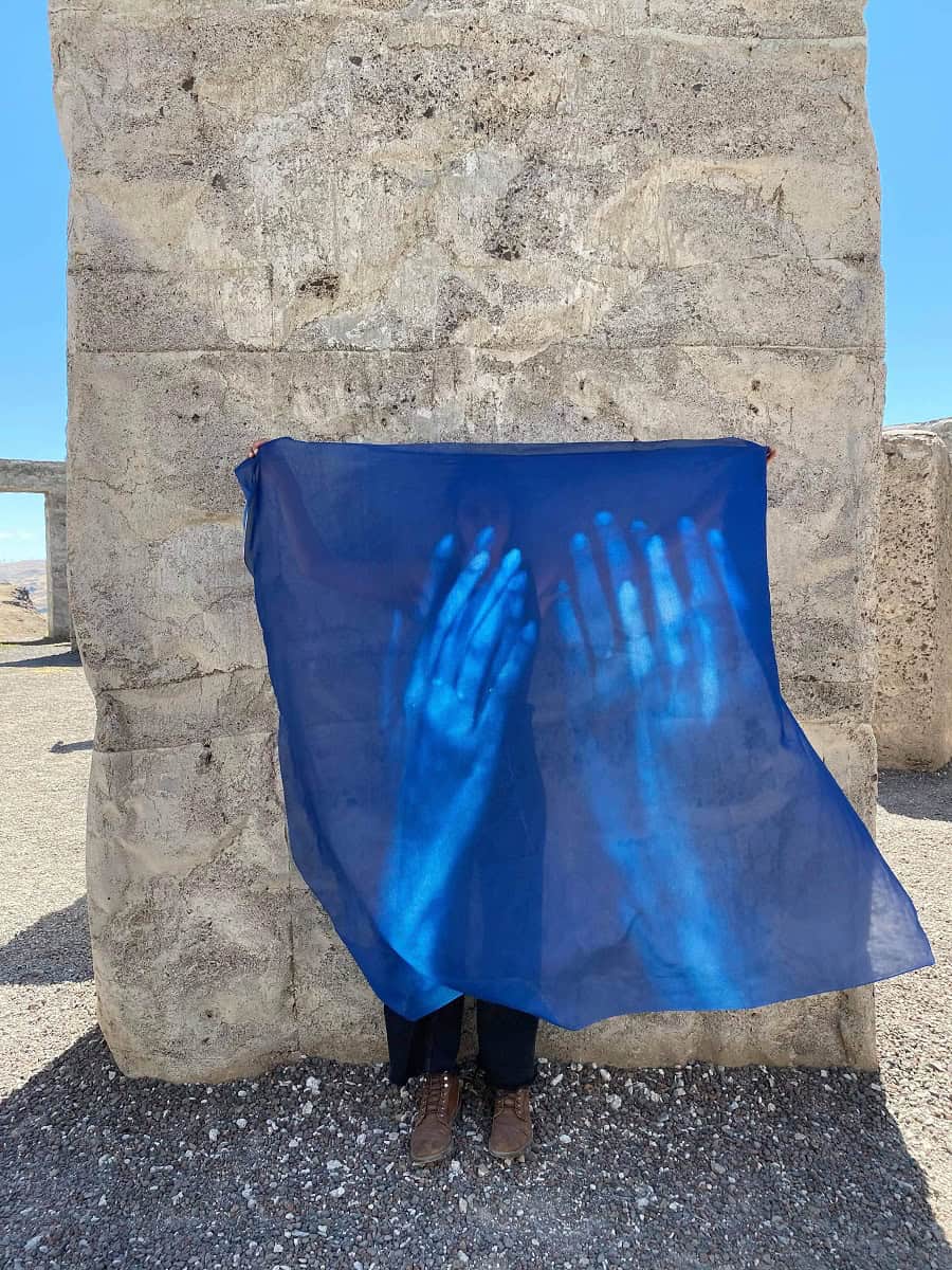 كما تعرض إبراهيم أيضًا 10 أعمال مطبوعة من نمط السيانوت على القطن من سلسلتها “من نحن خارج الظلام” ، والتي بدأت في عام 2020 وما زالت مستمرة.