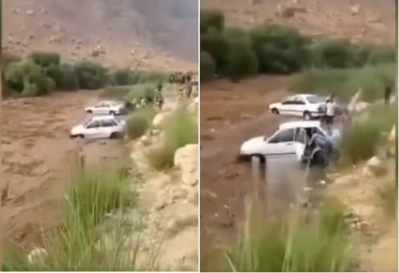 فيديو انجراف عدة سيارات وسط الصراخ بسبب فيضان نهر رودبال في إيران