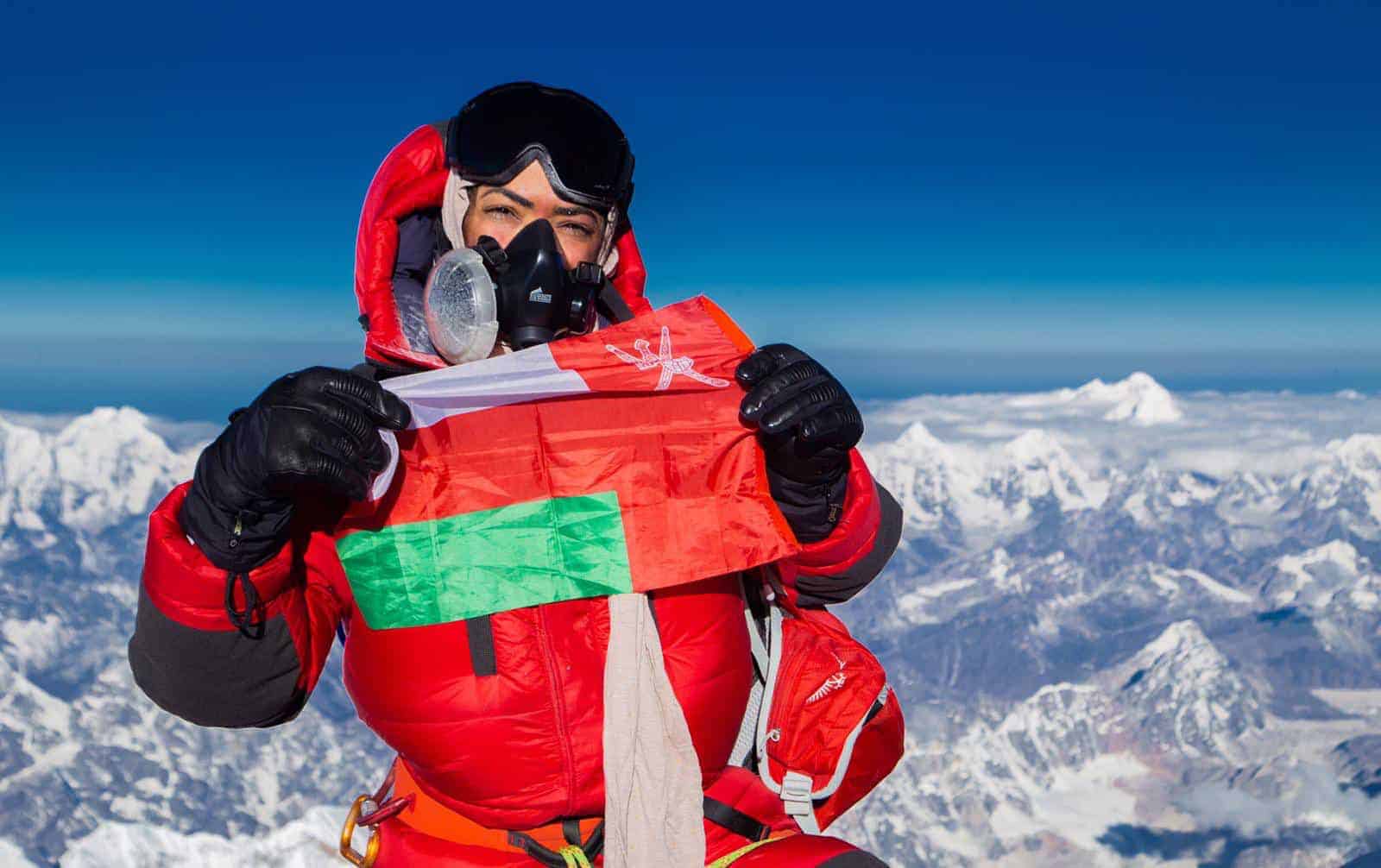 وظهرت “الحارثية” وهي أول امرأة عمانية تتمكن من الوصول إلى قمة جبل “إيفرست” عام 2019 وهي تحمل العلم العماني.