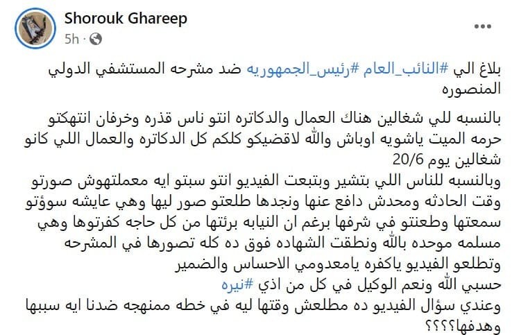 وكتبت عبر حسابها على “فيسبوك”،: “بلاغ إلى النائب العام ورئيس الجمهورية ضد مشرحة المستشفى الدولي في المنصورة بسبب تسريب الفيديو”.