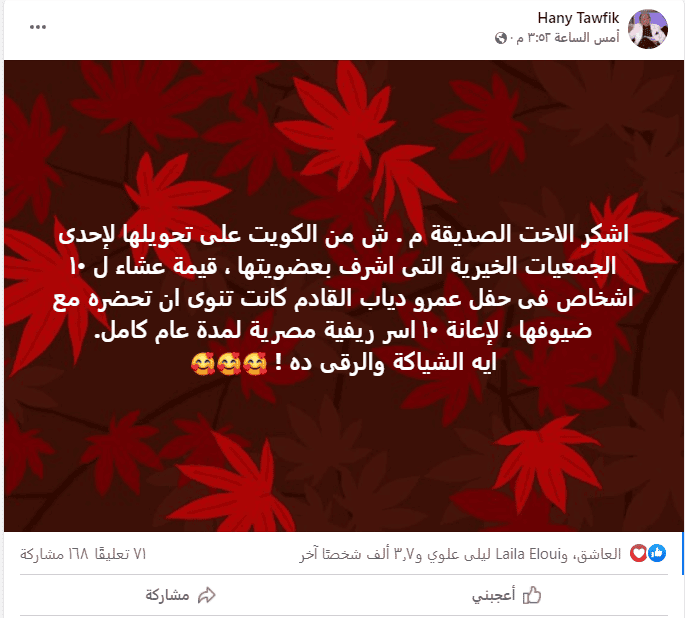 حيث كانت تنوي السيدة الكويتية “م.ش” يحسب ما ذكره هاني توفيق في منشوره، أن تحضر هذا الحفل مع ضيوفها.