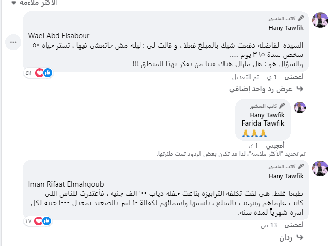 وفي رده على أحد المتابعين كشف هاني توفيق:”هى لقت تكلفة الترابيزة بتاعت حفلة دياب ١٠٠ الف جنيه، فأعتذرت للناس اللى كانت عازماهم. وتبرعت بالمبلغ ، باسمها واسمائهم لكفالة ١٠ اسر بالصعيد بمعدل ١٠٠٠ جنيه لكل اسرة شهرياً لمدة سنة.”