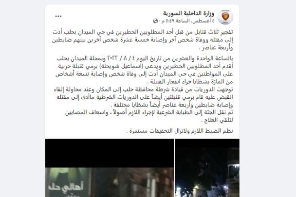 وبحسب صفحة وزارة داخلية النظام، فإن الشخص ويدعى “اسماعيل شويحنة” وهو أحد المطلوبين الخطيرين في حي “الميدان” بحلب. أقدم على رمي قنبلة حربية على المواطنين في الحي المذكور الساعة الواحدة والعشرين من تاريخ ٤ / ٨ / ٢٠٢٢، أدت إلى وفاة شخص وإصابة تسعة أشخاص من المارّة بشظايا جراء انفجار القنبلة.