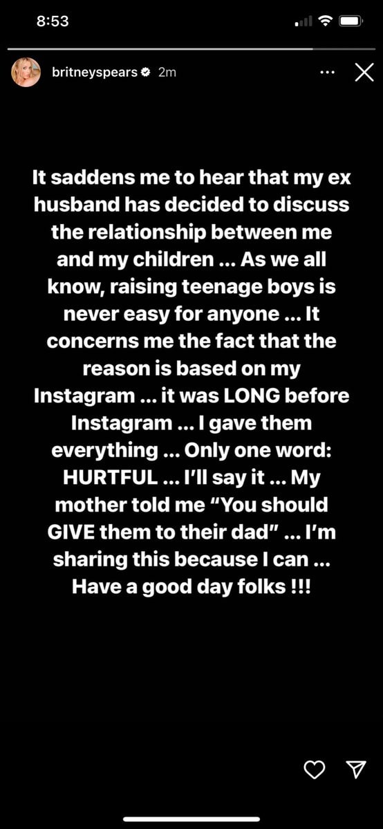 وقالت نجمة البوب: “إنه أمر محزن أن أسمع أن زوجي السابق قد قرر مناقشة العلاقة بيني وبين أبنائي”.