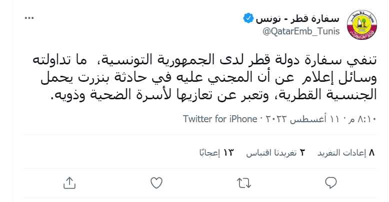 تنفي سفارة دولة قطر لدى الجمهورية التونسية، ما تداولته وسائل إعلام عن أن المجني عليه في حادثة بنزرت يحمل الجنسية القطرية، وتعبر عن تعازيها لأسرة الضحية وذويه.