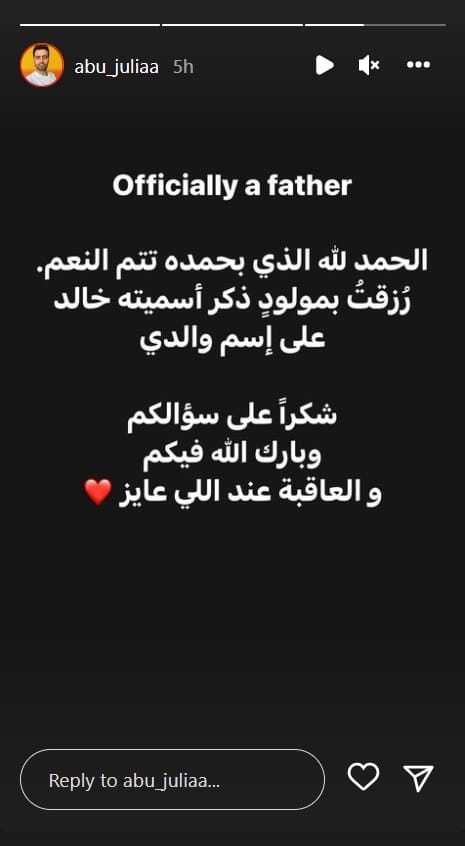 وكتب أبو جوليا على “ستوري” حسابه الرسمي في انستغرام: “الحمد لله الذي بحمده تتم النعم. رزقت بمولود ذكر أسميته على اسم والدي. شكراً على سؤالكم وبارك الله فيكم والعاقبة عند اللي عايز”.