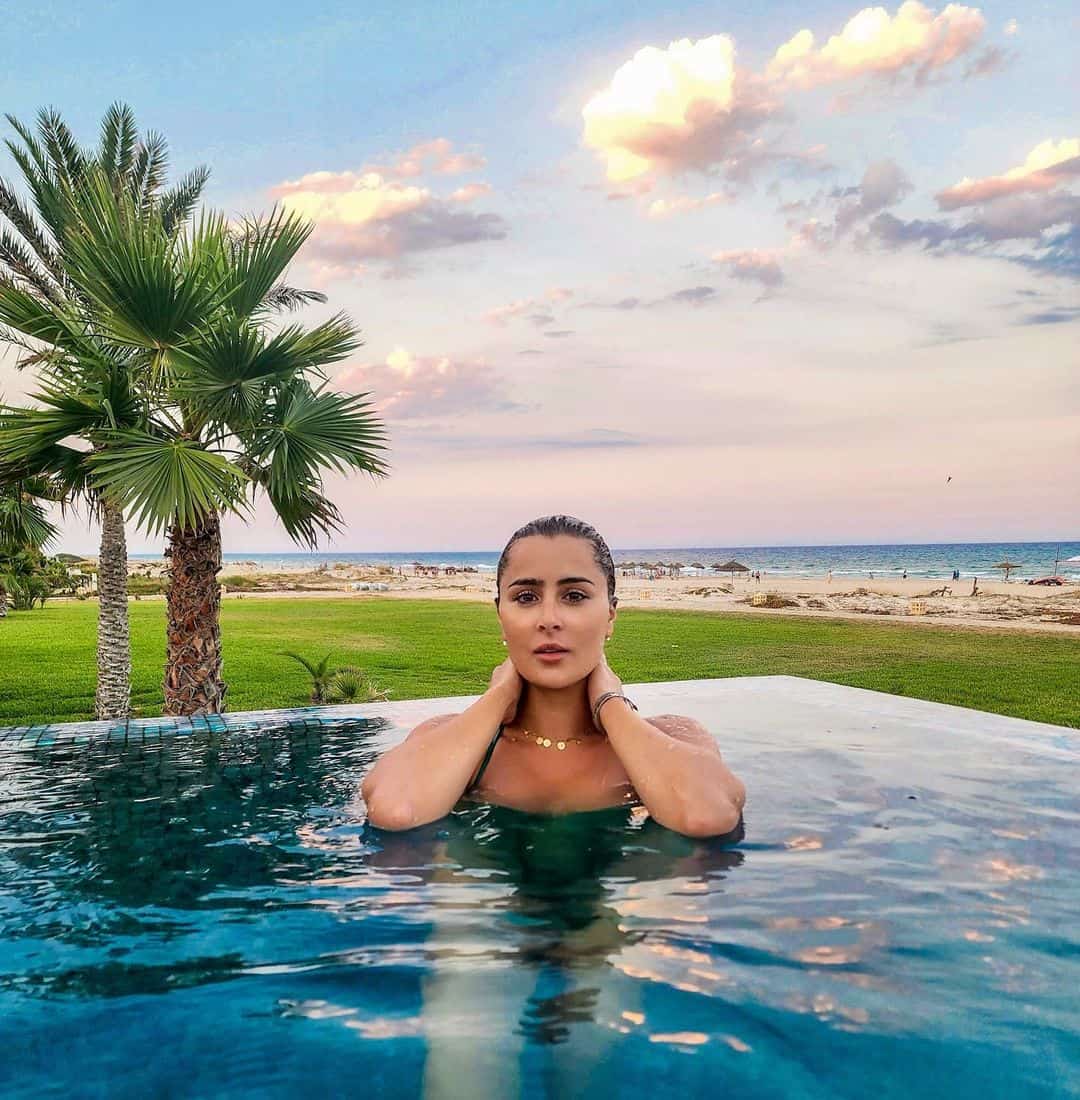 وتظهر عائشة بن أحمد في الصورة التي نشرتها عبر حسابها على “انستقرام”، وهي تستمتع بالسباحة مرتدية مايوه باللون الأخضر.