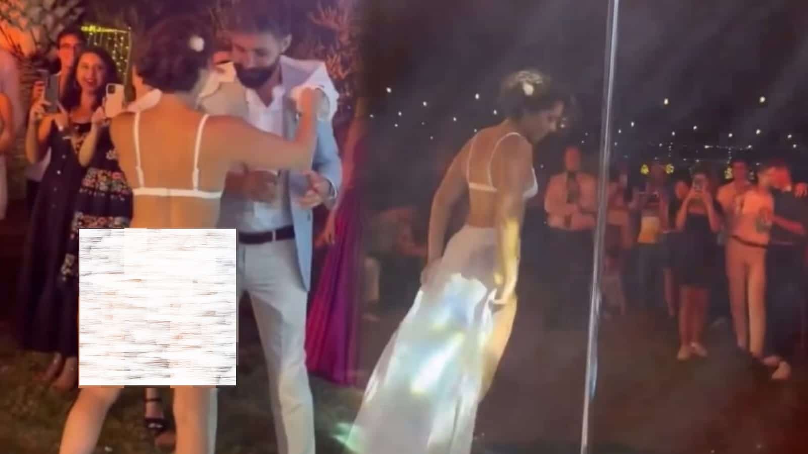 ثم سارعت العروس إلى خلع الفستان الأبيض، واستكملت رقصتها على العمود مرتدية البكيني.