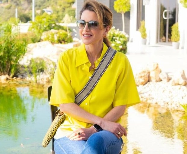 وارتدت الملكة رانيا أثناء زيارتها حاضنة( ليف-انك للإبداع) في الأردن بمحافظة البلقاء، قميصاً أصفر، مع بنطلون من الجينز الأزرق، وحذاءً رمادياً أنيقاً.