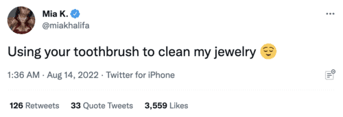 وكتبت مايا خليفة في التغريدة: “استخدم فرشاة أسنانك لتنظيف مجوهراتي”.