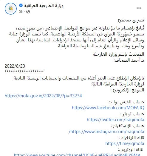 وفي أول رد لوزارة الخارجية العراقية بشأن الصور الخاصة بالسفير، قال المتحدث باسم الوزارة د. أحمد الصحاف، على صفحة الوزارة في ” فيسبوك” :”نُتابعُ بإهتمام ما تمَّ تداوله عبر مواقع التواصل الإجتماعي، من صورٍ تعنى بسفير جُمهُوريَّة العراق في المملكةِ الأردنيّة الهاشميّة.”