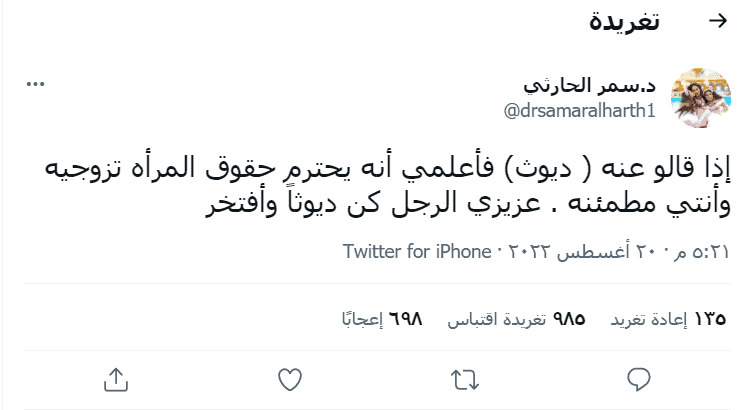 وفي تغريدة لها فجّرت الجدل بتويتر في السعودية، كتبت “الحارثي”: “إذا قالو عنه (ديوث)، فاعلمي أنه يحترم حقوق المرأة”.