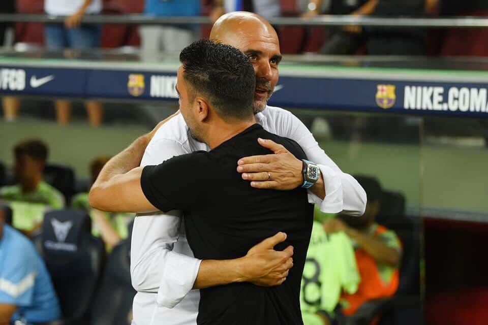 عناق بين مدري برشلونة تشافي ومواطنه مدرب مانشستر سيتي غوارديولا watanserb.com