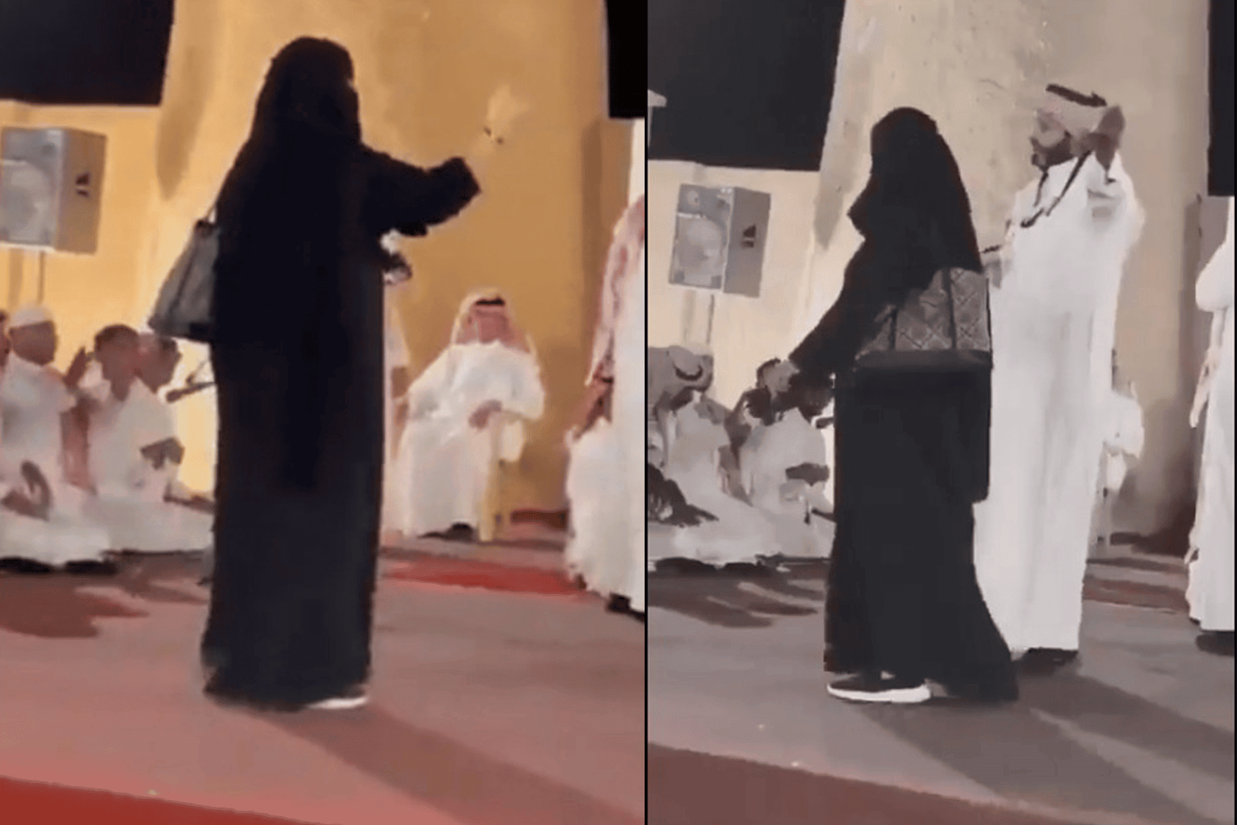وأظهر الفيديو، سيدة ترتدي نقاباً بالزي الأسود، وهي ترقص بين الرجال، وتبيّن أن شخصاً من منظمي العرضة قد وجّهها بالمغادرة، فاستجابت له.