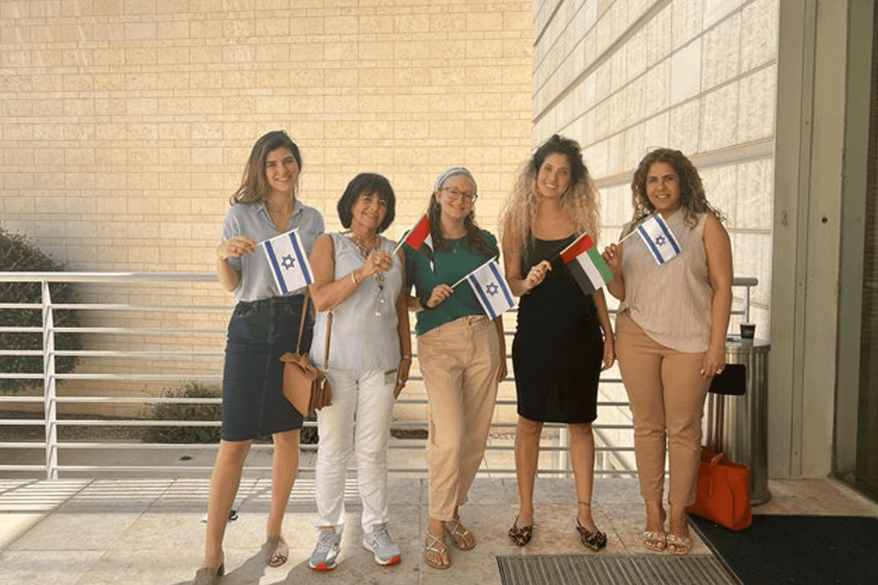 ونشرت صفحة “إسرائيل في الخليج” التابعة لخارجية الاحتلال على تويتر، صورة لعدد من الإسرائيليات وهن يحملن بالتناوب العلمين الإسرائيلي والإماراتي.