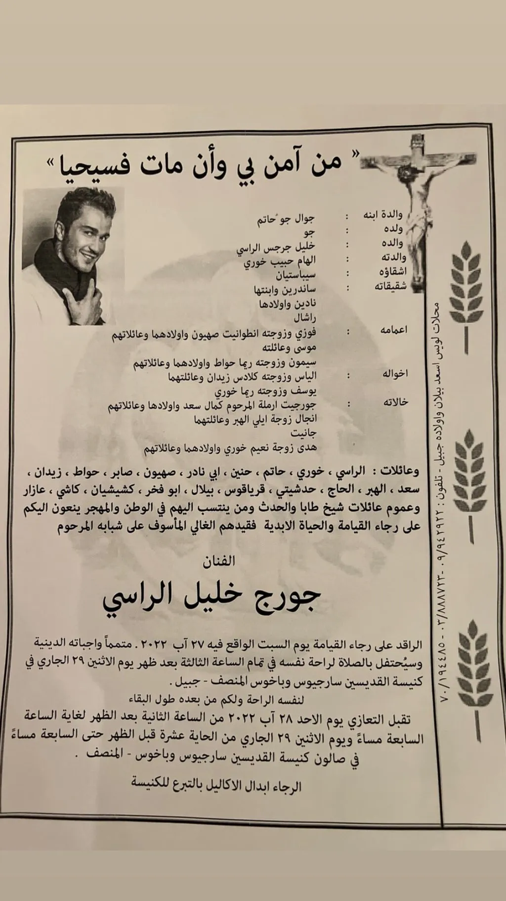 هذا وقد أعلنت عائلة الفنان الراحل جورج الراسي موعدَ تفاصيل مراسم الجنازة. فتقام الصلاة يومَ الاثنين في 29 من الشهر الجاري، في كنيسة القديسين سارجيوس وباخوس المنصف–جبيل.
