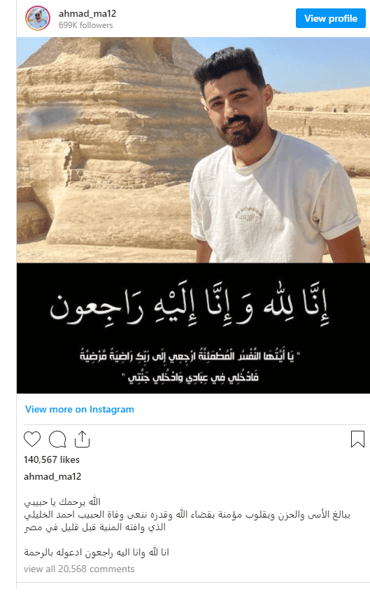 وكان منشور نزل على صفحة “أحمد الخليلي” بانستغرام، يعلن عن وفاته بشكل مفاجئ في مصر دون كشف أي تفاصيل أخرى، ما تسبب بصدمة كبيرة بين متابعيه.