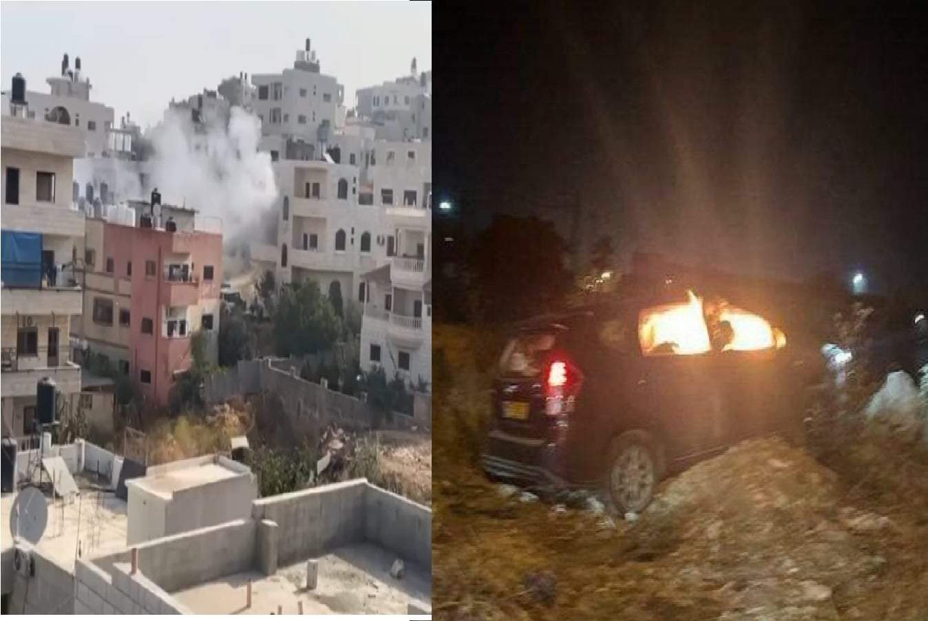 في يمين الصورة إحراق سيارة مستوطنين في نابلس وإلى اليسار حصار منزل في قرية روجيب شرق المحافظة