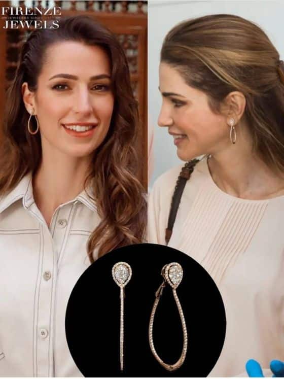 وهذه المرة، أعارت الملكة رانيا، خطيبة نجلها رجوة، أقراطاً من Firenze Jewels المصنوعة من الذهب الوردي عيار 18 قيراط. والتي تحتوي على 184 ماسة بيضاء مستديرة. بقطع لامعة بوزن إجمالي يبلغ قيراطاً ونصف.