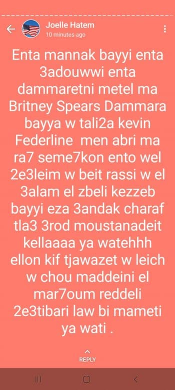وقالت :“إنت منك بيي، إنت عدوي، إنت دمّرتني متل ما بريتني سبيرز بيا دمرا وخطيبها، من قبري ما رح سامحكن، إنتوا والإعلام وبيت الراسي والعالم الزبالة، كذاب بيي اذا عندك شرف طلاع عروض المستندات كلها يا واطي، وقلّن كيف تجوزت وليش وعشو ممضيني المرحوم، ردّلي اعتباري لو بمماتي يا واطي”.