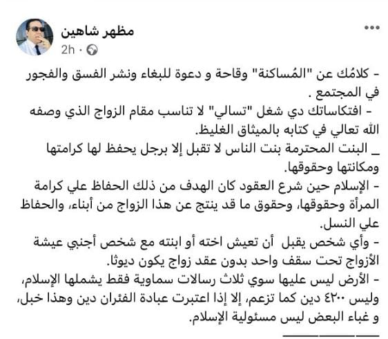كما هاجم الداعية الإسلامي مظهر شاهين عطية، قائلاً بمنشور عبر حسابه على “فيسبوك”: “كلامُك عن المُساكنة وقاحة ودعوة للبغاء ونشر الفسق والفجور في المجتمع”.