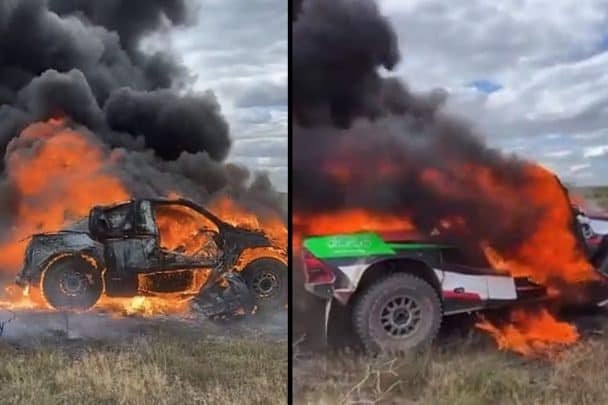 وكشف سائق الراليات السعودي، أن رائحة وقود انتشرت في المركبة، وأضيئت لمبة التنبيه وعلى الفور اشتعلت النيران بها ما أصابَهم بالصدمة.
