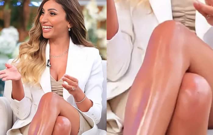 وارتدت دينا فستاناً قصيراً فوق الركبة، وفوقه بليزر أبيض. ولفتت النظر بساقيها التي بدت تلمع بشكل غريب.