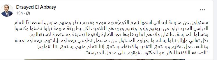 فكتب دكتور سيد العباسي: “مسئولون عن مدرسة ابتدائي اسمها (نجع الكوم)منهم موجه ومنهم ناظر ومنهم مدرس.استعدادًا للعام الدراسي الجديد نزلوا من بيوتهم وإدوا وقتهم وجهدهم للتلاميذ، لكن بطريقة ملهمة”.