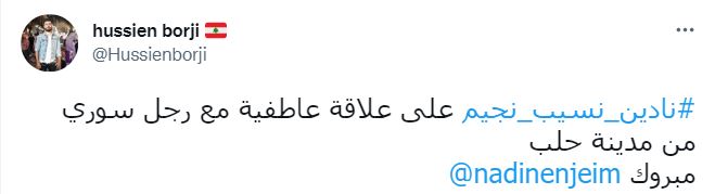 وكتب حسين برجي في تغريدة عبر حسابه على “تويتر”: “#نادين_نسيب_نجيم على علاقة عاطفية مع رجل سوري من مدينة حلب مبروك نادين”.
