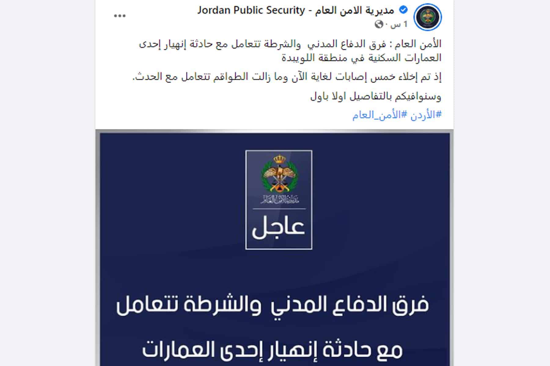 وقالت مديرية الأمن العام، الثلاثاء، إن فرق الدفاع المدني والشرطة، تتعامل مع حادثة انهيار إحدى العمارات السكنية المكونة من أربعة طوابق، في منطقة اللويبدة.