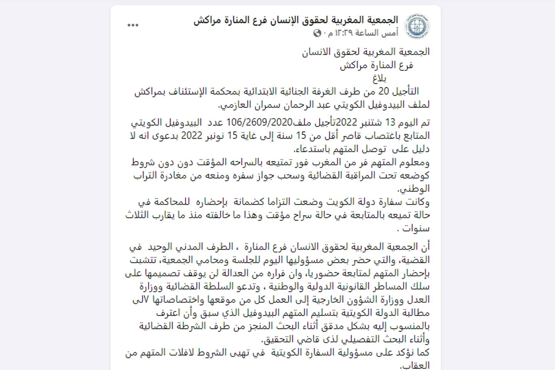 حيث كتبت الجمعية المغربية لحقوق الإنسان فرع المنارة، عبر صفحتها الرسمية على موقع فيسبوك أن “المتهم فر من المغرب فور إخلاء سراحه بشكل مؤقت دون شروط، كوضعه تحت المراقبة القضائية وسحب جواز سفره ومنعه من مغادرة التراب الوطني.”