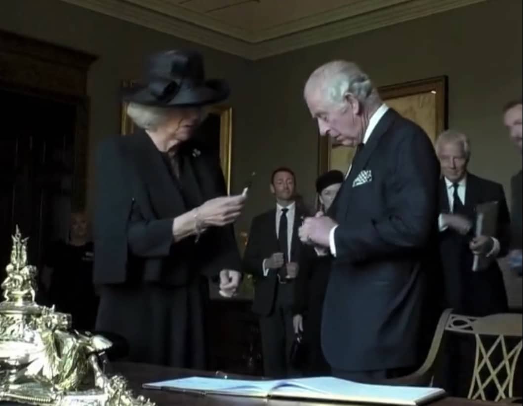 لكنّ الأسوأ حدث، عندما لطّخ تشارلز الثالث يده بحبر القلم، فنهض غاضبًا من كرسيه، وقال: “يا إلهي، أنا أكره هذا” ثم سلّم القلم لكاميلا، زوجته.