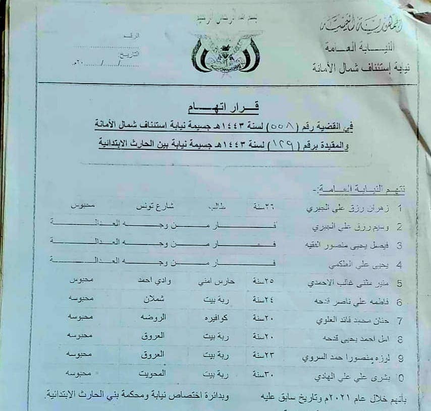 ووفقاً لوثيقة صادرة عن النيابة العامة، فإن الأشخاص المتهمين هم: زهران رزق علي الجبري، ووسيم رزق، وعلي الجبري “هارب”، وفيصل يحيى منصور الفقيه “هارب”، ويحيى علي العلكمي “هارب”.