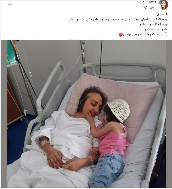 وكتبت سالي: “يا عمري بوعدك لح تسافري وتتعالجي وترجعي توقفي عإجريكي وتربي بنتك. لو بدا تكلفني حياتي عليي وعأعدائي الله يشفيكي يا اغلى من روحي”.