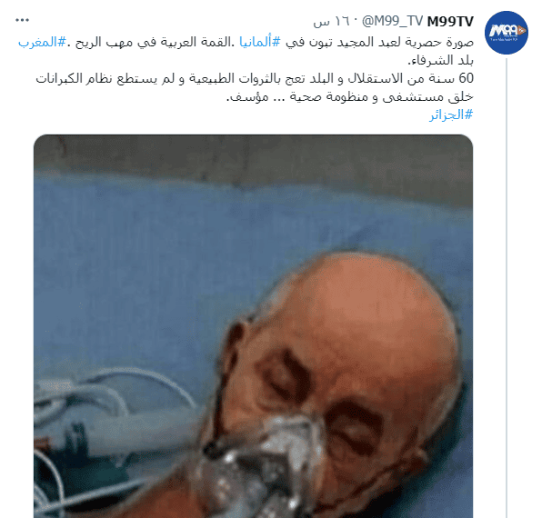 وطن- في إطار الحرب الإعلامية الشرسة بين المغرب والجزائر والتي انعكست أيضا على مغردي البلدين وتحول مواقع التواصل الاجتماعي إلى ساحة صراع جديدة، نشر حساب قناة “M99-TV” صورة زعمت فيها القناة بأن الرئيس الجزائري عبدالمجيد تبون في حالة مرضية حرجة في إحدى المستشفيات الألمانية.