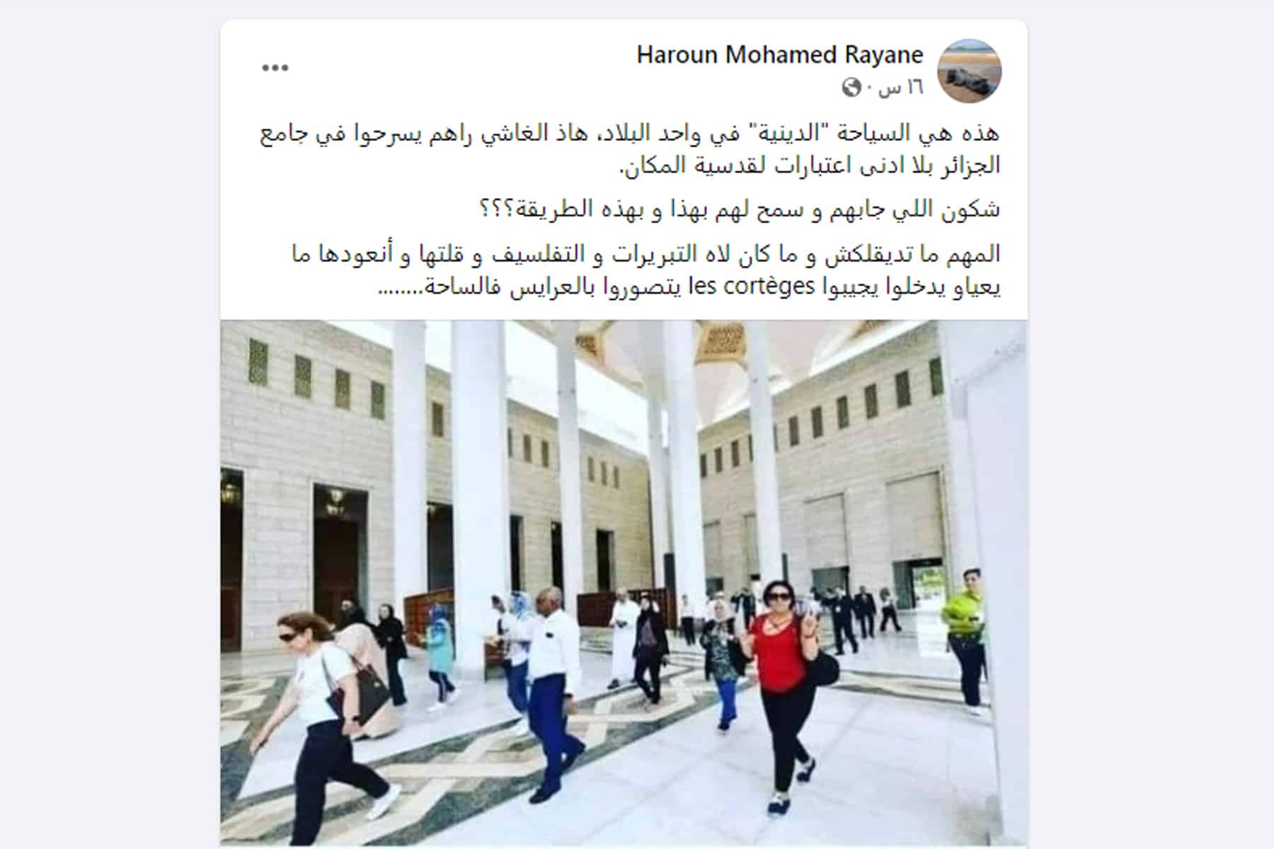 وفي هذا السياق كتب ناشط باسم “هارون محمد ريان”، عبر حسابه بفيسبوك: “هذه هي السياحة “الدينية” في واحد البلاد، هاذ الغاشي راهم يسرحوا في جامع الجزائر بلا ادنى اعتبارات لقدسية المكان.. شكون اللي جابهم و سمح لهم بهذا و بهذه الطريقة؟!”.