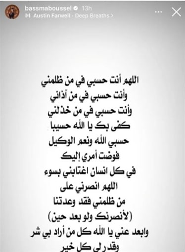 وفي منشور آخر، كتبت بسمة دعاءً عن الظلم والأذى، جاء فيه: “اللهم أنت حسبي فيمن ظلمني، وأنت حسبي فيمن آذاني، كفا بك يا الله حسيبا. حسبي الله ونعم الوكيل، فوضت أمري إليك، في كل إنسان اغتابني بسوء اللهم انصرني على من ظلمني فقد وعدتنا ( لأنصرنك ولو بعد حين)، وأبعد عني يا الله كل من أراد بي شر وقدر لي كل خير”.