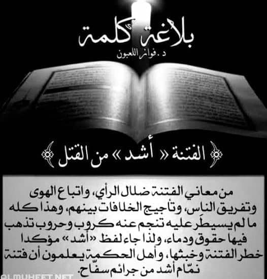 وتابع المنشور: “من معاني الفتنة ضلال الرأي، واتباع الهوي وتفريق الناس وتأجيج الخلافات بينهم. وهذا كله ما لم تسيطر عليه تنجم عنه كروب وحروب تذهب فيها حقوق ودماء. ولذا جاء لفظ ”أشد“ مؤكدا خطر الفتنة وخبثها وأهل الحكمة يعلمون أن فتنة نمّام أشد من جرائم سفاح”.