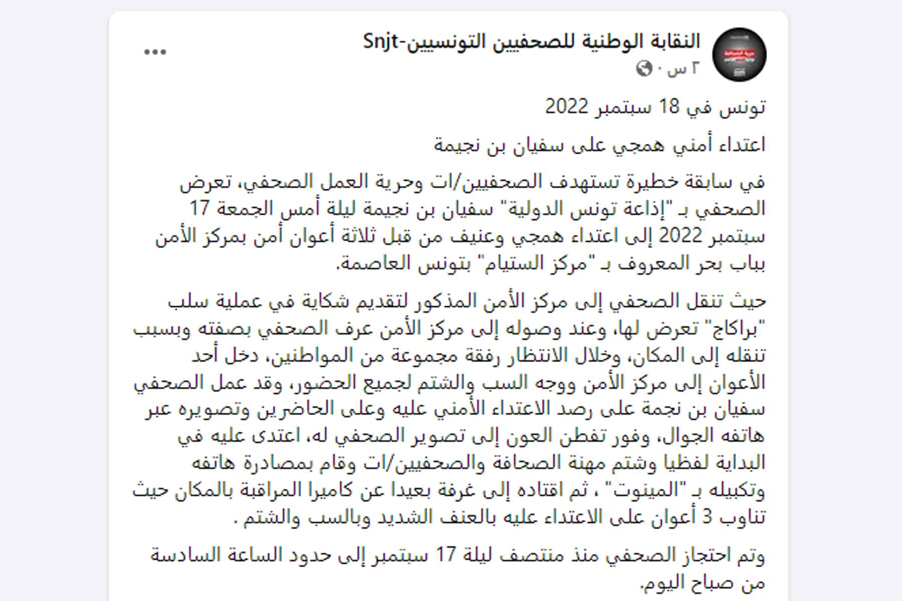 إعتداء أمني عنيف على الصحفي بإذاعة تونس الدولية سفيان بن نجيمة في مركز بوسط العاصمة إثر ذهابه للمركز لتقديم شكاية بعد تعرضه لبراكاج#يسقط_الانقلاب_في_تونس pic.twitter.com/IKFNJlm7Pv— 🌟🌟 ✌️✌️نــايـڵــة🌼🌺🌷🌺🇵🇸 (@nallou222) September 18, 2022