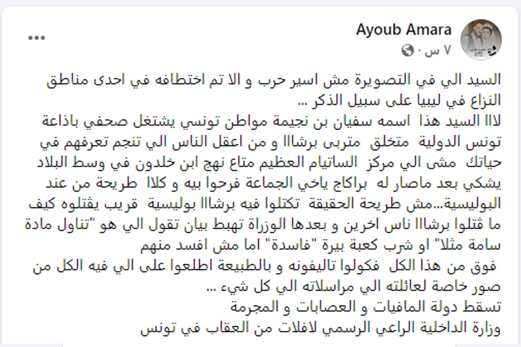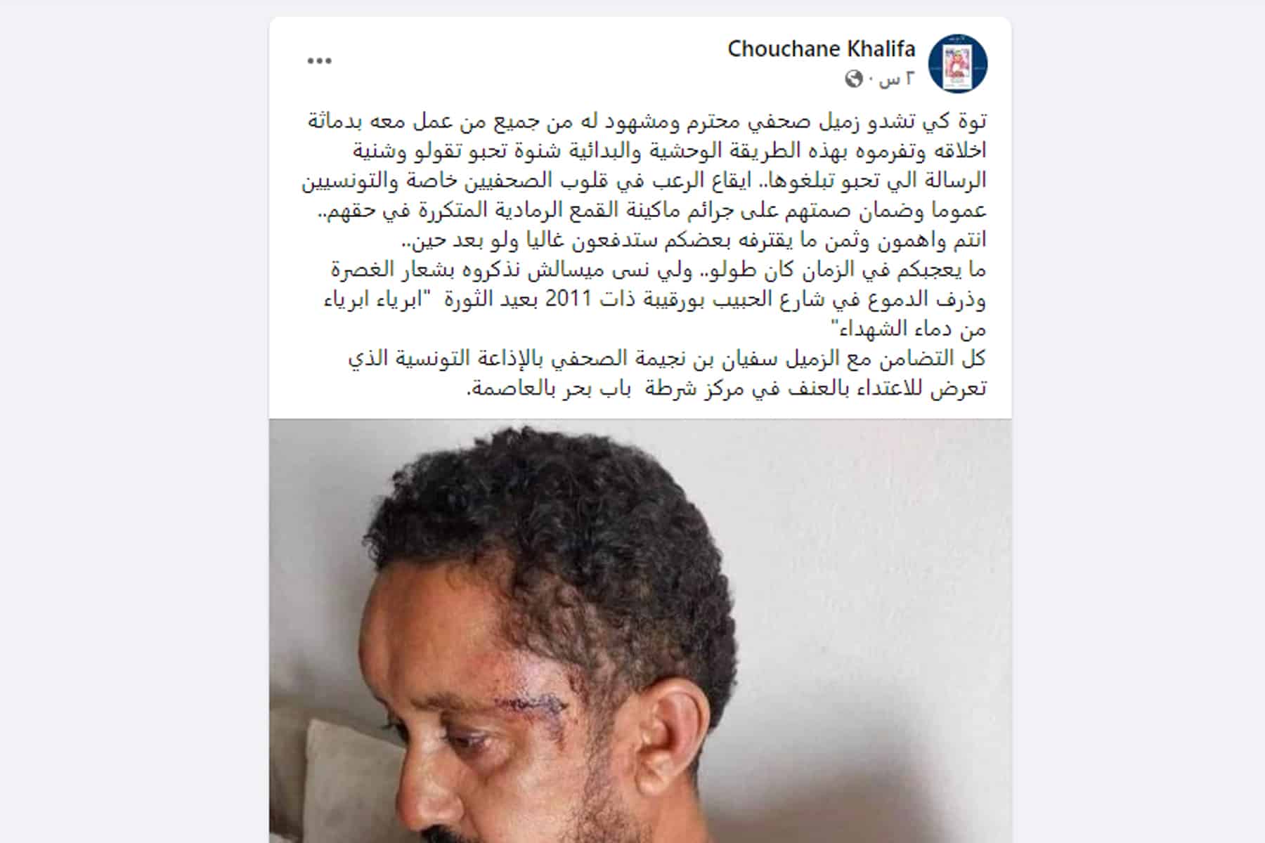 وكتب عبر حسابه الخاص على موقع “فيسبوك” يقول، “إن سفيان الذي تعرض لكل هذا الضرب المبرح ليس أسير حرب أو أنه شخص مختطف في إحدى مناطق النزاع، إنه فقط مواطن تونسي يشتغل صحفي بإذاعة تونس الدولية”، حسب قوله.
