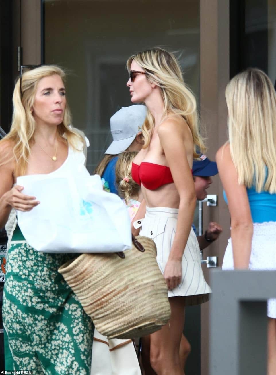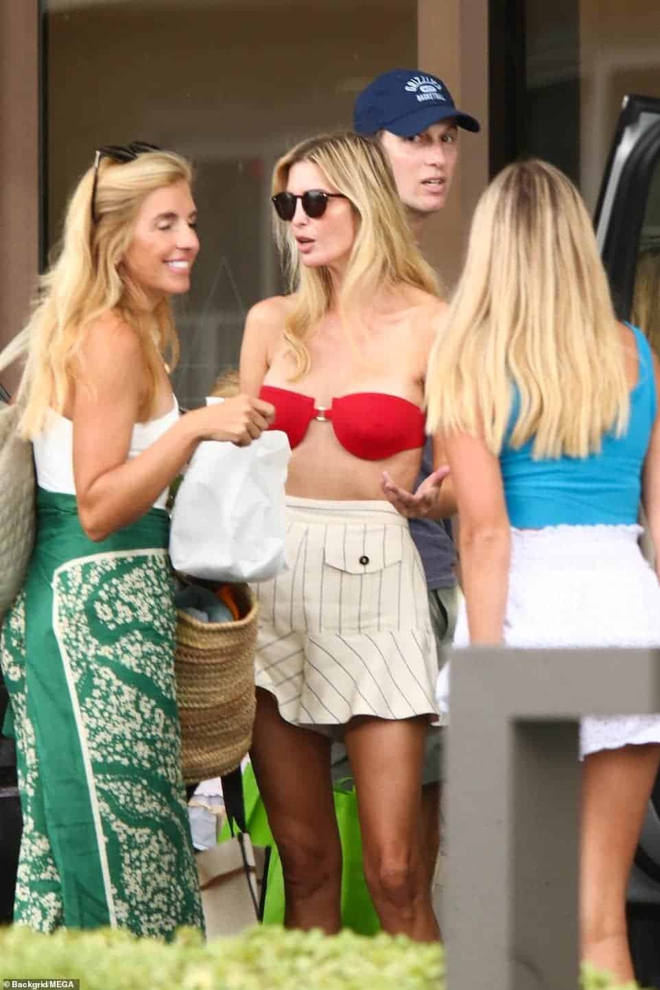 وكانت إيفانكا ترامب ترتدي بيكيني أحمر من الأعلى، وشورت أبيض مخطط بالأسود.