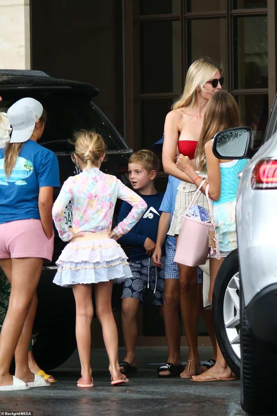 وكانت إيفانكا ترامب ترتدي بيكيني أحمر من الأعلى، وشورت أبيض مخطط بالأسود.